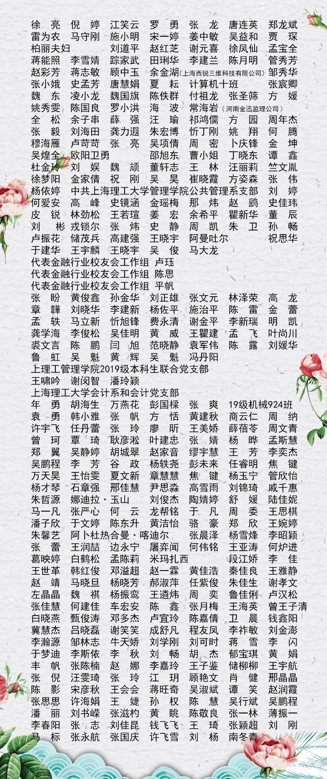 单位捐赠(按捐赠先后排序)珠海格力电器股份有限公司海拉(上海)管理有限公司上海爱尔眼科医院有限公司广州市埃维诺电脑技术开发有限公司马克思主义学院2020届研究生毕业生太仓申星锻造有限公司(高淡兴校友)材料学院2020届本科生毕业生材料学院2020届研究生毕业生个人捐赠(按捐赠先后排序)邱茂华李臻朱群东疫情防控专项基金捐款(按捐赠先后排序)捐物(按捐赠先后排序)衷心感谢对上海理工大学教育事业发展给予帮助和支持的单位及个人!
