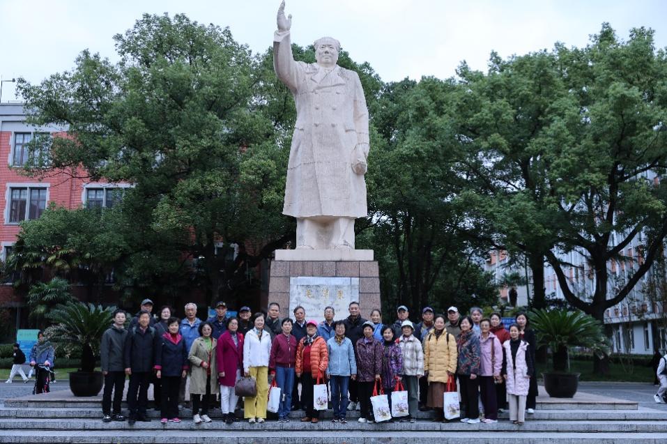 交流环节结束后,校友们移步至校园中心的毛主席像前合影留念。一张张笑容在镜头前绽放,不仅记录下重逢的喜悦,更承载着四十年不改的深情与对母校的眷恋。