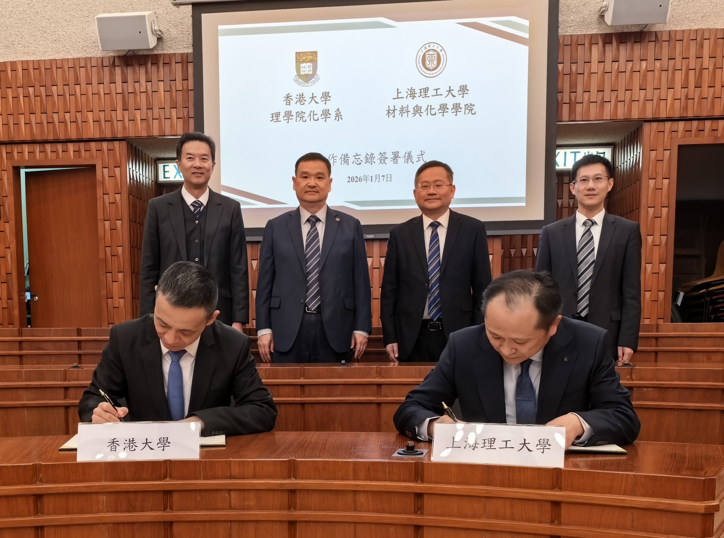 1月7日下午,代表团访问香港大学,与全球事务副校长尹晓波及理学院、化学系等相关负责人进行会谈。在前期扎实科研合作的基础上,香港大学理学院与我校材化学院正式签署了合作备忘录。双方将在人才培养、师生交流、平台建设等方面探索合作新路径,进一步推进“铋科学与健康医学材料沪港联合实验室”的建设。